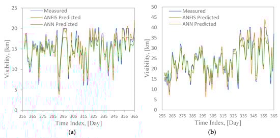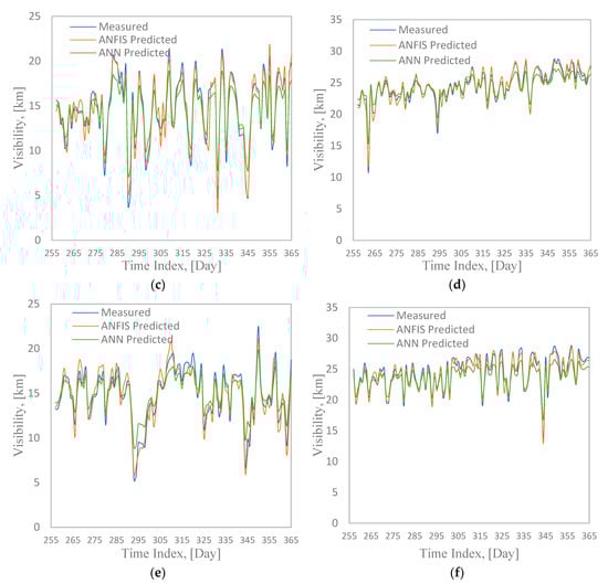 Figure 22a–f illustrates time series prediction results comparing measured and predicted data by both the ANN and ANFIS models for all locations. The actual and predicted data in this case are the testing data, which represent 30% of the entire study year. Thus, the time index on the x-axis spans from the 257th day to the 365th day of the study year. These results demonstrate differences between the measured and predicted data utilizing the two AI models. The outcomes show better estimation using the hybrid algorithm over the ANN algorithm for all the locations using the testing data. The ANFIS model showed more accuracy over ANN in predicting visibility. Table 8 shows the RMSE of the results predicted by both the ANN and ANFIS algorithms. The testing RMSE for the ANFIS algorithm was quite lower than that of the ANN algorithm for all cities considered. For example, the RMSE of Durban using the hybrid algorithm was as low as 0.1172 compared to a higher RMSE of about 1.4051 by the ANN model during testing. Therefore, a similar improvement was consistently observed for all other cities considered.