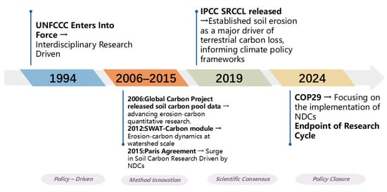 Although there is extensive literature describing the impact of soil erosion on soil carbon cycling that spans a wide range of subjects, few studies have employed knowledge mapping to provide an in-depth analysis of the research hotspots and future research directions in this field. Bibliometrics is a quantitative method used to describe and analyze the dynamics and progress of a specific discipline or research area. This method utilizes relevant software (such as CiteSpace, VOSviewer) to generate clear and concise knowledge graphs that present literature analysis results in a visualized manner, allowing for the effective identification of the developmental pattern of a given research area [21,22]. Knowledge graphs, which depict the development process and structural relationships of knowledge, serve as both visual knowledge representations and serialized knowledge pedigrees. These graphs reveal complex relationships such as networks, structures, interactions, intersections, evolutions, and derivations among knowledge units or groups [23]. Therefore, the present study employed bibliometric methods and visualization analysis tools (CiteSpace and VOSviewer [24,25]). We selected 1994–2024 as the study period, as it fully covers key stages in soil carbon research. Firstly, in 1994, UNFCCC entered into force, which spurred interdisciplinary research [26,27,28,29]. Studies like the 2006 Global Carbon Project, which released soil carbon pool data and applied techniques such as carbon tracing and erosion modeling [30,31,32], improved research conditions by advancing soil erosion–soil carbon sink studies. Then, the NDC mechanism of the 2015 Paris Agreement further drove research. In 2019, the IPCC SRCCL report first established soil erosion as a major driver of terrestrial carbon loss. Finally, in 2024, COP29 assessed NDC implementation, therefore forming a complete policy cycle (Figure 1). Our selection shows methodology evolution from qualitative to quantitative and captures the dynamic interaction between climate policy and scientific research.