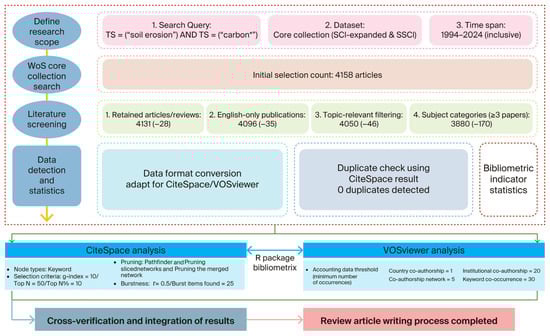 The data for this study were sourced from the Clarivate (Philadelphia, PA, USA) Web of Science (WoS) Core Collection database (2025). Comprehensive and accurate retrieval was ensured by selecting the Science Citation Index Expanded and Social Sciences Citation Index. The search strategy employed was topic search TS = (“soil erosion”) AND TS = (“carbon*”), covering the period from 1 January 1994 to 31 December 2024; the document types were limited to articles or review articles, with the language restricted to English. On 30 March 2025, we conducted the aforementioned search (all data collection was based on complete calendar years to ensure consistency in comparative analyses), and this search yielded a total of 4159 articles. Drawing on past experience [33,34], the collected literature was processed in the following sequence. First, we defined the study’s focus as “the impact of soil erosion on carbon cycling under climate change,” covering the underlying mechanisms and research trends related to how climate change influences soil erosion processes and how these processes in turn affect the transport of soil organic carbon, carbon sink functions, and ecosystem carbon balance. Literature was limited to articles and review articles to ensure robust metric data and maintain the core academic focus of the study. While conference proceedings offer valuable insights, we focused on journal articles for standardized citation metrics, peer-reviewed rigor, and to avoid duplication following Bibliometric–SLR guidelines [35]. Following this, we went through each document: those that did not fit the research theme or meet the search criteria were excluded; documents with the same concepts were consolidated; then, terms with low frequency (fewer than three occurrences) were removed. Ultimately, a sample of 3880 articles was obtained.