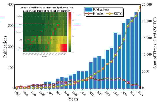 The number of articles published in an academic field annually can represent the trend of attention the field has received in recent years [41]. The number of articles published on the impact of soil erosion on soil carbon cycling is shown in Figure 3. From 1 January 1994 to 31 December 2024, the number of published articles pertinent to soil erosion and soil carbon cycling research and the sum of times cited (SOTC) generally exhibit exponential growth trends. According to Price’s law, this research field is in a phase of rapid development, with research directions and new technologies emerging continuously [42]. Overall, this research field has moved through two stages: a slow development stage (1994–2011) and a rapid growth stage (2012–2024). During the slow development stage, the number of articles published on the impact of soil erosion on soil carbon cycling grew slowly, with an average annual increase of five articles. During 2012–2023, a rapid growth stage was entered. During this stage, there was an average annual increase of 20 articles compared to the previous year, with 2012, 2016, and 2018 each seeing increases of more than 40 articles.