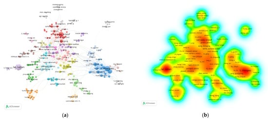 (a) A network visualization map for the co-authorship analysis; (b) density visualization produced based on the number of articles published by the authors.