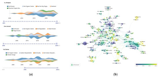 An analysis of co-authorship networks enabled us to identify the main researchers who are investigating the impact of soil erosion on soil carbon cycling and their close collaborative relationships [45]. Using VOSviewer software, we overlaid and visualized the co-authorship networks of authors who have published more than five articles in the field, leading to six clusters (Figure 4a). In the cluster view, authors of the same color belong to co-authorship networks in the same cluster, the sizes of the dots represent the numbers of published articles, and the lines show the collaborative links between authors. Overall, researchers investigating the impact of soil erosion on soil carbon cycling display distinct network characteristics, with strong collaborative relationships within smaller scopes. As shown in Figure 4b, the largest network belongs to “Lal, Rattan,” an internationally renowned researcher of soil erosion and management from the United States, followed by “Li, Zhongwu” from China and “Van Oost, Kristof” from Belgium. To evaluate their long-term research impact, we analyzed both the thematic evolution in Figure 5a and the quantitative metrics in Table 1. As shown in Figure 5a, “Lal, Rattan” has conducted long-term research with a stable number of published articles in this field, with persistent focus on core themes (soil organic carbon and carbon sequestration) that underpin enduring influence while increasingly integrating climate change dimensions. Meanwhile, “Li, Zhongwu” has undertaken a large amount of research since 2015, with the research interest in soil erosion–soil organic carbon gradually increasing and citation relevance rising accordingly (Table 1). Research by “Van Oost, Kristof” was mainly conducted after 2005 and has fluctuated considerably among topics, mirroring transient thematic contributions (such as soil degradation and soil erosion peaks) visible in their interest dynamics.