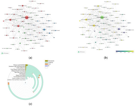 As shown in Table 2, the top 10 publishing institutions in terms of the number of published articles included six universities and four research institutes. The Chinese Academy of Sciences published the most publications (475 publications), significantly surpassing the publishing institution that came in second place, Northwest A&F University. Based on these findings, the Chinese Academy of Sciences was the most representative institution for research on the impact of soil erosion on soil carbon cycling. In terms of publication quality, the Chinese Academy of Sciences ranked first (H = 78), followed by the United States Department of Agriculture—Agricultural Research Service (USDA-ARS; H = 64). As shown in Figure 6c, which illustrates the comprehensive strengths of the above-mentioned top 10 publishing institutions, the Chinese Academy of Sciences was found to be the most prominent research institution in this field.