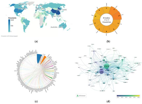 (a) Geographic distribution map based on the total publications from researchers in different countries/regions; (b) distribution map of the top 10 countries with H-index values; (c) a cross-country/region collaborations visualization map—here, the thickness of the line between countries reflects the frequency of cooperative research; (d) overlay visualization of the country co-authorship analysis.