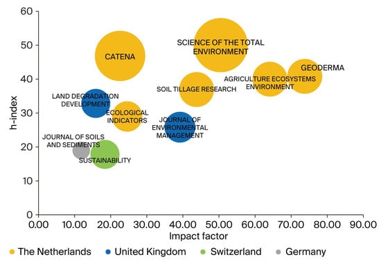 Bubble chart of journals impact factor vs. H-index, with bubble size as publication count, grouped by country.
