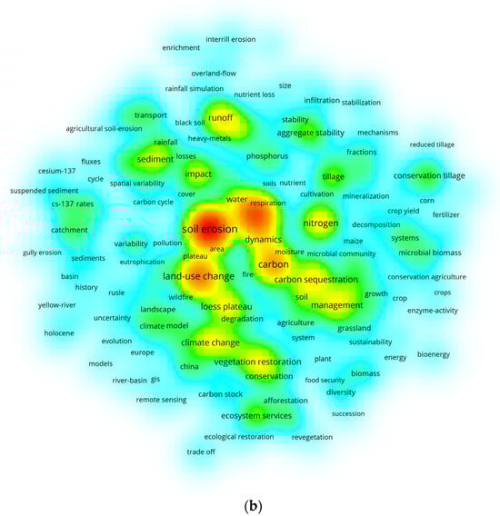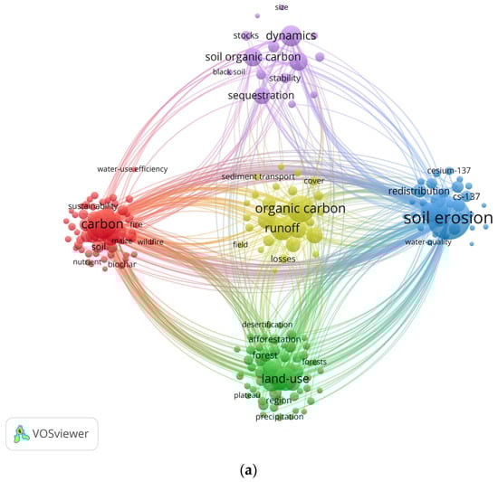 Using the visualization software VOSviewer, a keyword co-occurrence network analysis of keywords appearing from 1994 to 2024 was conducted after the synonyms were merged. This study encompassed 194 core terms. The high-frequency keywords that appeared more than 30 times are listed in Table 4, of which “soil erosion” (1856 occurrences) was the most frequently occurring. As shown in Figure 9a, five major keyword clusters representing five themes were formed. In this figure, a larger circle node indicates increased frequency of the keyword, indicating that it is more representative as a research hotspot in this field. The line connections in this figure represent the strength of association, with thicker lines indicating more frequent co-occurrence in the same documents. Node colors represent different clusters, i.e., research themes. Density visualization (Figure 9b) can be used to identify research hotspots, with darker areas indicating higher intensity of interest and attention within this field. As shown in Figure 9b and Table 5, high-frequency keywords such as “soil organic carbon,” “organic matter,” “land-use change,” “nitrogen,” and “runoff” are representative terms in studies on the relationship between soil erosion and carbon. Furthermore, the different numbers of connections between each keyword cluster suggest the existence of overlapping relationships among research themes, aligning with the interdisciplinary nature of this research field.