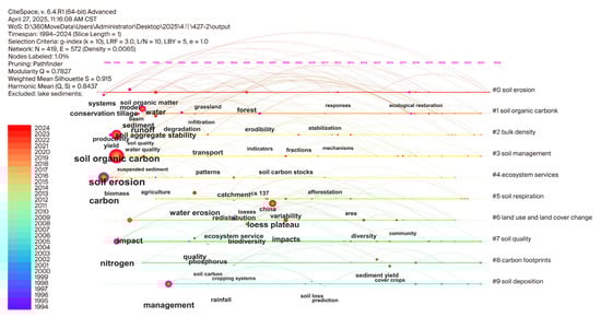 Keyword timeline visualization illustrates the developmental trajectory of research, including the rise, prosperity, and decline in specific clusters, with keywords of the same cluster appearing on the same horizontal line. A higher number of keywords indicates a more significant cluster domain, purple circles represent nodes with high betweenness centrality, and red nodes indicate the presence of high-frequency keywords. In this study, the top 10 keyword clusters based on the keyword co-occurrence analysis were selected for analysis using CiteSpace 6.4.R1. A keyword timeline diagram was generated using 1-year time intervals; then, this was used to analyze research themes, the first appearance time, and the development trends of various keywords. Based on the first appearance time, the duration of keywords used in keyword clustering analysis, and the density of nodes on the timeline, research themes pertinent to the impact of soil erosion on soil carbon cycling were categorized into clusters from #0 to #9. In the timeline visualization, the Q (modularity index) measures the significance of community partitioning, with values > 0.3 indicating statistically meaningful clusters, while S (weighted mean silhouette) evaluates intra-cluster cohesion and inter-cluster separation, with values > 0.7 denoting high-quality partitions. As shown in Figure 9, the clustering modularity (Q = 0.7827 > 0.4) and clustering silhouette score (S = 0.9150 > 0.6) indicated that the clustering results were reasonable [49].