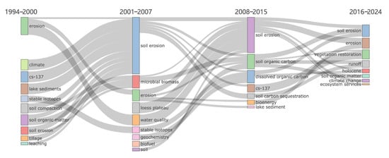 R bibliometrics—thematic evolution tool traces the progression of themes in research on the effects of soil erosion on soil carbon cycling, spanning from 1994 to 2024. Time segmentation points were established in 2000, 2007, and 2015.
