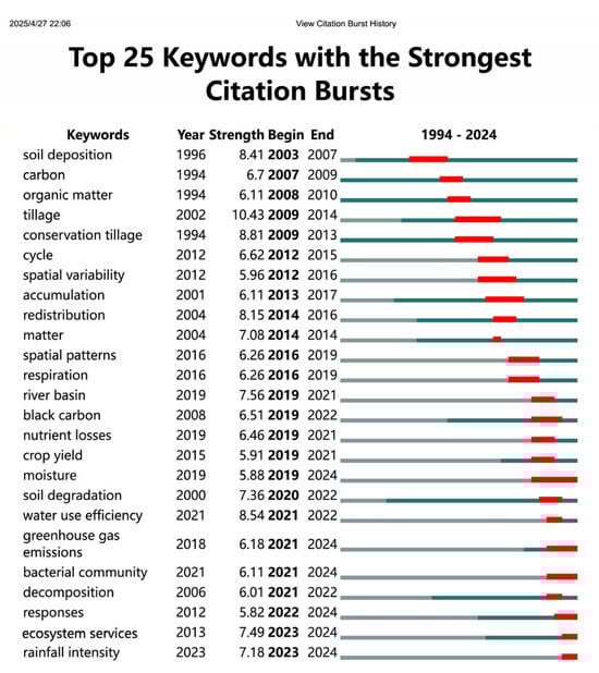 In 2002, Kleinberg proposed the burst detection algorithm [68], which can identify burst terms that appear less frequently but carry more informational significance than high-frequency terms. Since its introduction, the burst detection algorithm has become an important method for identifying research hotspots and emerging trends in a specific field [69]. In this study, the Kleinberg burst detection algorithm, built into the CiteSpace software, was employed to detect burst terms in interdisciplinary research on the impact of soil erosion on soil carbon cycling. By arranging detected burst terms into ascending order from the start time at which they became a hotspot, the top 25 burst terms were identified. These 20 burst terms were further classified as either past research hotspots or current research hotspots depending on whether their keyword popularity lasted until 2024. As shown in Figure 12, research on the impact of soil erosion on soil carbon cycling has undergone distinct stage-by-stage development over the past three decades (1994–2024). During the early stages of this research timeline (1990s), investigations predominantly explored underlying mechanisms, with soil deposition (burst intensity: 8.41) experiencing a rapid rise in research attention and organic matter (6.11) emerging as a core research focus [70,71]. Subsequently, in the 2000s, research efforts shifted towards agricultural management strategies. Comparative studies on conservation tillage (burst intensity: 8.81) and conventional tillage (10.43) reached significant research peaks [72,73,74], marking a transition to practical, application-oriented solutions for mitigating carbon losses caused by soil erosion. After 2010, terms such as spatial variability (burst intensity: 5.96) and redistribution processes (8.15) emerged with prominence, reflecting the establishment of multiscale research methodologies [75,76].