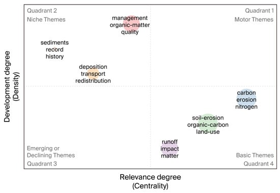 In 1988, Law et al. [83] first introduced the concept of strategic coordinates. The strategic coordinate diagram, which is based on thematic clustering (keyword clustering), visualizes the internal and external connections between themes, allowing quantitative assessment of the importance and development level of different themes in a specific field and exploration of the research hotspots, frontiers, and their development trends in a given field. As shown in Figure 13, the research themes pertinent to the impact of soil erosion on soil carbon cycling are mainly distributed in Q2 and Q4. These quadrants are mainly characterized by two overarching themes: “emerging crossover” and “professional foundation.” In the second quadrant (high centrality and low density), three key thematic clusters were formed: the “management–organic matter quality” cluster revealed the regulation mechanism of soil management on organic matter quality [84,85,86]; the “deposition–transport–redistribution” cluster focused on the landscape-scale migration process of carbon [87,88,89]; and the “sediments–records–history” cluster reconstructed the historical carbon cycle through sediment archives (for example, the tracing of carbon sources can be conducted via tracer techniques) [90,91,92]. At the same time, the three clusters of “soil erosion–organic carbon–land use,” “carbon–erosion–nitrogen”, and “runoff impact–matter” in the fourth quadrant (high density and low centrality) [93,94,95] were found to jointly construct the basic research framework in this field from the dimensions of land use impact, carbon–nitrogen coupling mechanisms, and runoff migration processes. Further combined with Figure 11, it can be seen that this cluster distribution is highly consistent with the intensity patterns of “redistribution” (8.15) and “nitrogen” (5.91) in keyword burst detection in recent years; this indicates that the study of the soil carbon cycle is changing from a single-factor analysis to a multi-process coupling system in a cognitive paradigm. Further observation in conjunction with the co-occurrence network (Figure 9b) reveals that in the retrieved 31-year dataset, although “soil erosion” is the core cluster, small-scale erosion processes (such as “catchment”, “gully erosion”, and “interrill erosion”) are still significantly correlated with carbon sinks. This indicates that the CiteSpace algorithm has covered multi-scale studies in the macro erosion–carbon correlation network, even if they are not separately highlighted as emergent terms.