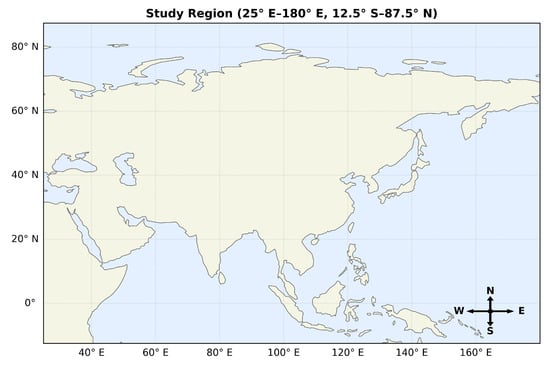 Due to computational complexity, this study focuses on a specific subregion (25° E–180° E, 12.5° S–87.5° N) encompassing all of Asia and surrounding regions. The study region is illustrated in Figure 1. This area encompasses both equatorial and mid-latitude regions, including the Equatorial Ionization Anomaly (EIA) zone, making it both distinctive and representative. To account for the impact of solar activity on TEC predictions, the dataset includes TEC maps from three years of high solar activity (2013–2015) and three years of low solar activity (2017–2019). The data are partitioned into the training set (2013–2014, 2017–2018; 17,520 maps) and testing set (2015, 2019; 8760 maps).