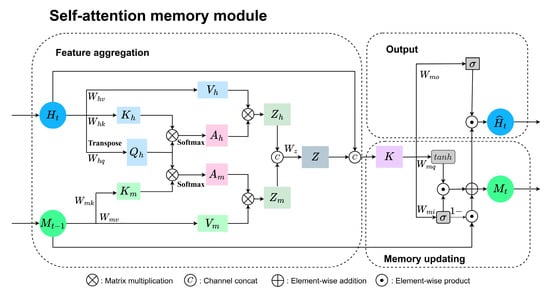 The SAM module takes two inputs: the current time step’s feature  and the previous memory state , which memorizes long-term spatial dependencies []. It outputs an updated memory state  and a fused feature . The detailed structure of SAM is shown in Figure 2.