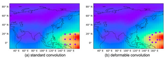 While spatiotemporal models such as ConvLSTM and ConvGRU currently dominate TEC prediction, they face two critical limitations. One of the challenges faced by TEC prediction is how to effectively model the long-term spatial correlation of TEC. Although the existing spatial–temporal model based on ConvLSTM can effectively capture local spatial features, in order to capture long-term spatial features, it is necessary to stack multiple convolution layers. However, the inherent limitations of convolution operation will cause the effective receptive field to be much smaller than the theoretical receptive field, which makes the long-term correlation modeling inefficient []. Another issue is the shape of the convolution kernel. Most existing models use standard convolution, and the sampling points of their convolution kernels are fixed regions. However, TEC is dynamically changing, and predictions for the future may come from irregular regions. Therefore, it is very important to flexibly capture the changing characteristics in spatially irregular TEC regions.