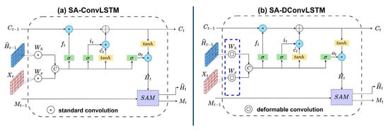 Considering the merit of deformable convolution, this paper embedded it into SA-ConvLSTM and proposed SA-DConvLSTM. The structure comparison between SA-ConvLSTM and SA-DConvLSTM is shown in Figure 4, where our improvements are marked in the blue box.