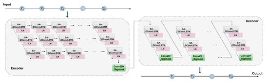 On the basis of the SA-DConvLSTM units introduced earlier, we organized these units into an encoder–decoder architecture to construct our TEC spatiotemporal prediction model, called ED-SA-DConvLSTM. As shown in Figure 5, the model architecture consists of two parts: an encoder for feature extraction and a decoder for prediction generation.