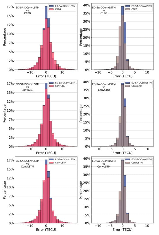 Figure 7 further illustrates the pairwise comparison of error distributions between ED-SA-DConvLSTM and three other comparative models. In Figure 5, the left side represents high solar activity, and the right side represents low solar activity. The horizontal axis of each subgraph represents the prediction error value  of the model, and the vertical axis represents the proportion of ∆ in each interval. ED-SA-DConvLSTM shows higher proportions of zero-error predictions () than C1PG, ConvGRU, and ConvLSTM, demonstrating its superior TEC prediction accuracy.