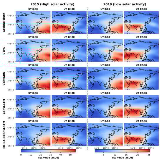 As evidenced in Table 4, the proposed ED-SA-DConvLSTM demonstrates superior predictive performance compared to all benchmark models (C1PG, ConvGRU, and ConvLSTM) across both solar activities. During high solar activity (2015), the model achieves  reductions of 10.27%, 7.65%, and 7.16% relative to C1PG, ConvGRU, and ConvLSTM, respectively, while under low solar activity (2019), these improvements reach 11.46%, 4.75%, and 4.06%. Furthermore, ED-SA-DConvLSTM consistently delivers the lowest MAPE in both solar activities.
