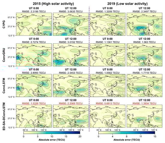 To visually compare the prediction performance of different models, we selected one day during high solar activity (DOY 196, 2015) and low solar activity (DOY 196, 2019), presenting TEC prediction maps and corresponding absolute error maps at two representative time points (UT 0:00 and UT 12:00), as shown in Figure 8 and Figure 9, respectively. The  is marked in Figure 7 (with the minimum value in red). The results indicate that the proposed ED-SA-DConvLSTM achieves the lowest  among all models, particularly in the Equatorial Ionization Anomaly (EIA) region, demonstrating its superior ability to capture TEC variations.