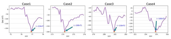 The selection of geomagnetic storm events in 2015. The orange point pointed by the green arrow is the minimum Dst index.