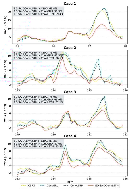 We first calculated the  of all models for each geomagnetic storm event and the improvement of ED-SA-DConvLSTM compared to C1PG, ConvGRU, and ConvLSTM, as shown in Table 5. The results demonstrated that the ED-SA-DConvLSTM consistently achieved the lowest  across all four geomagnetic storm events, exhibiting superior prediction performance throughout the entire storm period. These proved that the ED-SA-DConvLSTM has more stable prediction ability during the whole geomagnetic storm.