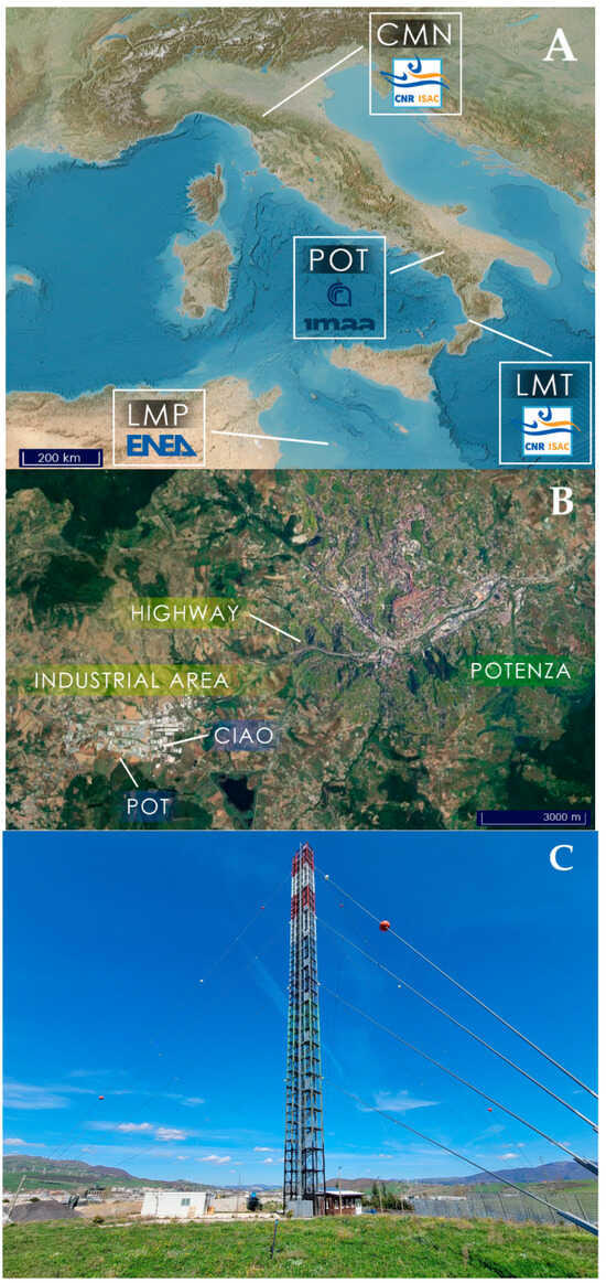 (A) A Map of Italy showing the general outline of the cross-country consortium of atmospheric observation sites performing continuous carbon isotope measurements. (B) Focus on the area where POT is located with respect to the regional capital of Potenza and nearby infrastructures. (C) A side view of the tower.