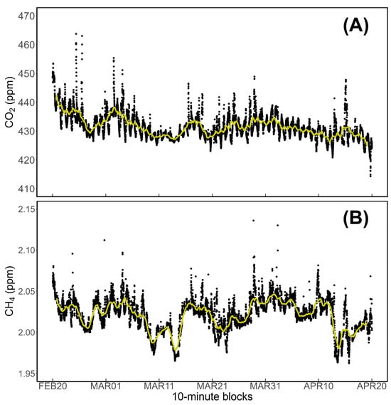 Variability in (A) CO2 and (B) CH4 during the measurement period (20 February–20 April 2025). Yellow lines indicate a moving average of 36 h. Saharan dust intrusion events occurred on 10–14, 16–18, and 22–24 March.