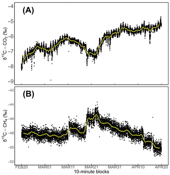 Variability in (A) δ13C-CO2 and (B) δ13C-CH4 during the measurement period (20 February–20 April 2025). Yellow lines indicate a moving average of 36 h. Saharan dust intrusion events occurred on 10–14, 16–18, and 22–24 March.