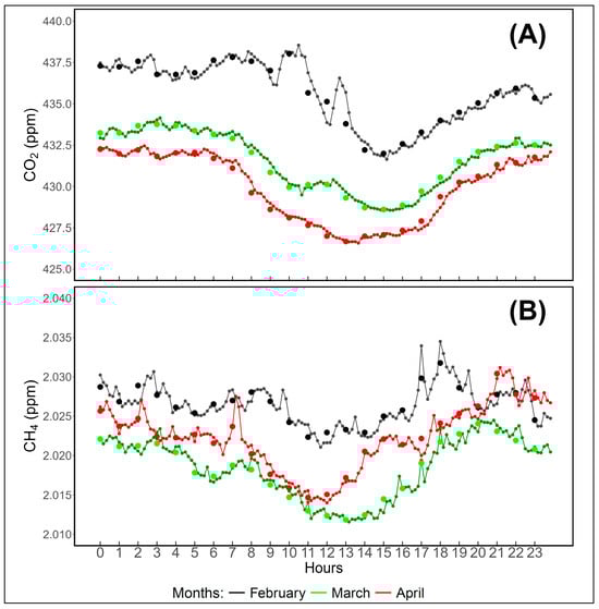 Daily cycles of (A) CO2 and (B) CH4 during the measurement period (20 February–20 April 2025). The larger dots indicate hourly averaged data, while the smaller ones refer to 10 min blocks.