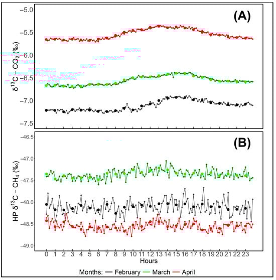 Daily cycles of (A) δ13C-CO2 and (B) δ13C-CH4 during the measurement period (20 February–20 April 2025). The larger dots indicate hourly averaged data, while the smaller ones refer to 10 min blocks.