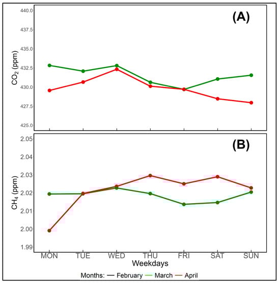 Weekly cycles (MON-SUN) of (A) CO2 and (B) CH4 during the measurement period (1 March–20 April 2025).