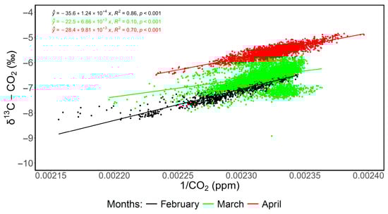 Keeling plots [72] is an effective methodology by which it is possible to pinpoint the isotopic fingerprint of emission sources. In this study, the first Keeling plot computed by the Italian atmospheric monitoring consortium is shown (Figure 9); however, this is limited to CO2 only, as the analysis of CH4 did not yield statistically relevant results. The evaluated data are categorized on a monthly basis, an approach employed in research works such as Hoheisel et al. [95].