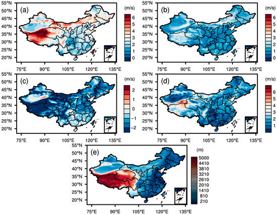 Figure 1 presents a comparison between the spatial distribution of ERA5 surface wind speed climatology and observations over China. Surface wind speed averaged across China exhibits significant regional variations. On average, observational data show that regions including the western Tibetan Plateau, northern Inner Mongolia, northern Xinjiang and Gansu, and parts of the three northeastern provinces exhibit relatively higher wind speeds, whereas areas such as eastern Sichuan, Chongqing, Guizhou, and Hunan demonstrate lower wind speeds (Figure 1a). The ERA5 reanalysis data effectively captures the spatial distribution characteristics of average surface wind speed across China (Figure 1b), with a spatial correlation coefficient of 0.491 (p < 0.01). However, the ERA5 data tend to underestimate the average surface wind speed in most parts of China compared to observational data (Figure 1c), particularly in the western Tibetan Plateau, northern Inner Mongolia and Gansu, western parts of the three northeastern provinces, and western Sichuan, where the discrepancies between ERA5-derived surface wind speeds and observational data are more pronounced, with larger RMSD (Figure 1d). Thus, ERA5 systematically underestimates surface wind speed across China, especially in high-elevation regions with complex topography, such as Xizang, Qinghai, and western Sichuan (Figure 1c,e).