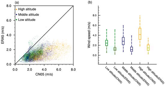 (a) Comparison of 1961–2018 mean 10 m wind speed between CN05.1 observations and ERA5 reanalysis for three elevation zones: low (<1000 m), middle (1000–3500 m), and high (≥3500 m). (b) Mean 10 m wind speed from CN05.1 observations and ERA5 reanalysis, averaged across three elevation zones. Boxplots show the 25th and 75th percentiles (box limits), median (central line), and full data range (whiskers: minimum to maximum values).
