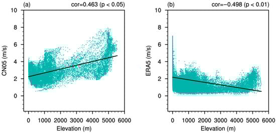 Scatter plots of 1961–2018 mean surface wind speed versus elevation across China: (a) observational data and (b) ERA5 reanalysis data.