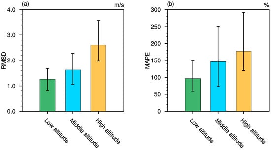 Seasonal surface wind speeds in ERA5 exhibit consistent elevation-dependent biases, with larger deviations in spring/summer and smaller deviations in autumn/winter across all elevation zones (Figure 6). The maximum RMSD occurs in high-altitude regions during spring (mean: 3.3 m/s), while the minimum appears in low-altitude regions during winter (mean: 1.0 m/s) (Figure 6a). For MAPE, peak values occur in high-altitude regions during summer (mean: 412%), contrasting with winter minima in low-altitude regions (mean: 103%) (Figure 6b). This seasonal discrepancy between RMSD (spring peak) and MAPE (summer peak) may stem from differences in mean wind speed magnitudes between seasons. In summary, ERA5 demonstrates relatively accurate characterization of surface wind speeds in low-altitude regions, particularly during autumn and winter, but shows significant deficiencies in high-altitude areas, especially in spring and summer.
