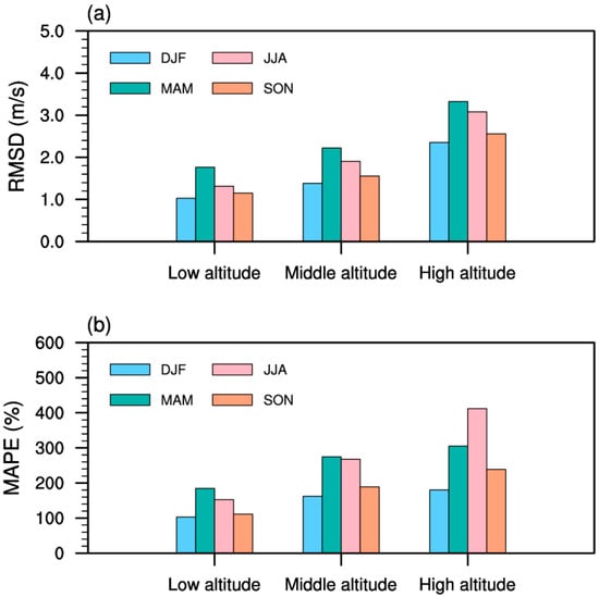 Seasonal (a) RMSD and (b) MAPE between CN05.1 observations and ERA5 reanalysis data, stratified by three elevation zones: low (<1000 m), mid-altitude (1000–3500 m), and high (≥3500 m). Seasons: DJF (December–January–February), MAM (March–April–May), JJA (June–July–August), SON (September–October–November).