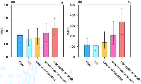Accordingly, ERA5 exhibits larger errors in plain areas than in hilly areas. The median RMSD and MAPE in plains are 1.7 m/s and 117%, respectively, both exceeding those in hilly regions (median RMSD: 1.4 m/s; median MAPE: 110%). Both RMSD and MAPE between observations and ERA5 data peak in high-relief mountainous areas (median RMSD: 2.2 m/s; median MAPE: 336%), significantly exceeding values in low-relief regions (median RMSD: 1.4 m/s; median MAPE: 140%) (Figure 8). This pronounced contrast underscores the limitations of ERA5 in simulating wind dynamics over steep terrain. These maximal RMSD (Figure 8a) and MAPE (Figure 8b) values over high-relief terrain may indicate that ERA5 systematically underestimates orographic wind enhancement and poorly represents slope-induced accelerations [81,82,83].