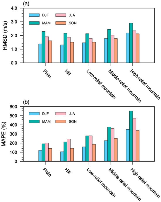 Regarding seasonal wind speeds, ERA5 exhibits relatively small biases over plains, hills, and low-relief mountains, but shows larger deviations in medium- and high-relief mountainous areas. The most significant biases occur in high-relief mountains during spring (mean RMSD: 2.9 m/s, Figure 9a; mean MAPE: 553%, Figure 9b), whereas the smallest deviations are found in hilly regions during winter (mean RMSD: 1.3 m/s, Figure 9a; mean MAPE: 106%, Figure 9b). Consequently, ERA5 exhibits significant deficiencies in representing wind fields across complex topography, particularly during spring and summer seasons.