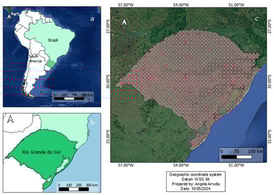 Geographical representation of the study area. (a) South America, highlighting Brazil; (b) The State of Rio Grande do Sul, located in southern Brazil; (c) Spatial distribution of the 670 precipitation points used in this study, derived from CHIRPS gridded data (0.05° resolution). These points correspond to pixel centroids where 45-day precipitation accumulation values were extracted, representing local rainfall behavior during the study period.