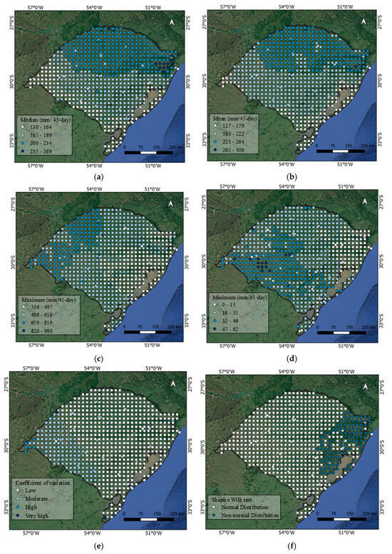 A discrepancy was also observed between the mean values (265 to 306 mm/45 days) and medians, indicating the occurrence of extreme events that increase the mean. This asymmetry suggests that the exclusive use of the mean may lead to the underestimation of critical events, highlighting the importance of joint analysis with the median. The extreme values further illustrate these spatial contrasts. Maximum values were concentrated in the central-west region, while minimum values (0–62 mm/45 days) predominated in the southwest, reflecting episodes of drought. These patterns are important for water resource planning and risk mitigation.