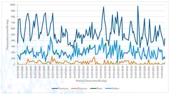 Over the 17-year period, subseasonal precipitation showed high temporal variability (Figure 3). Median values ranged from 33 mm to 462 mm per 45-day period. The highest median occurred between 27 October and 10 December 2009, followed by a peak in late 2015.