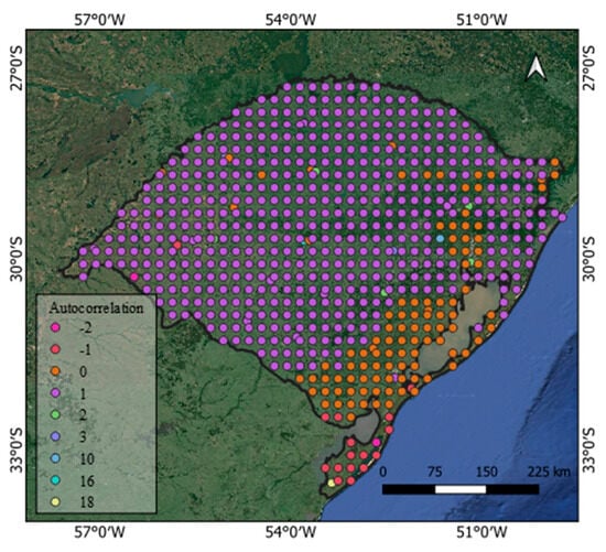 The remaining 642 points correspond to regular grid points from CHIRPS, a quasi-global gridded precipitation dataset that blends infrared satellite imagery with in situ station data using interpolation algorithms [21]. These grid points were systematically extracted from Google Earth Engine using an even spacing of approximately 0.05° (~5.5 km), ensuring full spatial coverage across RS. The CHIRPS was selected over other satellite products such as GPM or TRMM due to its longer historical coverage, better spatial resolution for continental regions, and stronger validation performance over South America in similar studies. Although cross-validation between CHIRPS and ground stations would ideally be conducted, it was not feasible in this study due to the limited number of operational rain gauges with consistent and complete data in certain areas, particularly in mountainous regions like Serra Gaúcha.