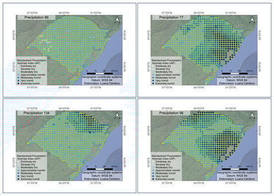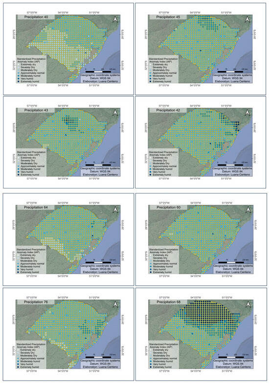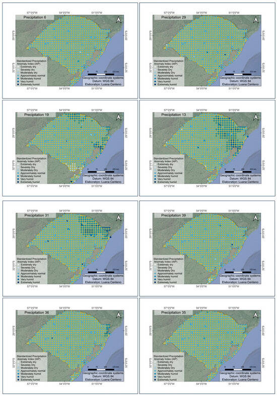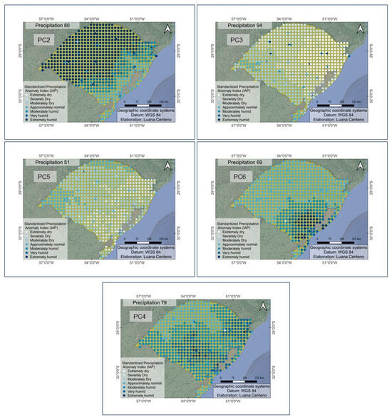 The SPI classification followed the guidelines of [24], as described by [25]. The SPI was preferred over generic precipitation anomaly indices for its ability to standardize precipitation across different spatial and temporal contexts, allowing a comparison across the 670 locations and the 13,845-day intervals. Together, the PCA and SPI analyses enabled the identification of dominant precipitation modes and the characterization of hydrometeorological extremes at a sub-seasonal scale. These tools contributed to the interpretation of spatially heterogeneous responses to climate variability across the complex topography of Rio Grande do Sul.