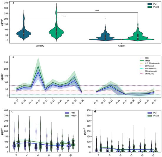 Seasonal, daily, and diurnal distribution of PM1 and PM2.5. (a) The seasonal distribution. The shaded areas represent the probability density of the data, with wider sections indicating higher data density at those values. The black boxes within the violins denote the interquartile range, with the white line inside representing the median. The vertical lines extend to the minimum and maximum values, excluding outliers. The asterisks indicate significant differences in concentration between the two months, with **** denoting a p-value < 0.0001 based on a t-test, highlighting highly statistically significant differences. (b) The daily distribution. The shaded area represents the standard deviation. (c) The diurnal distribution in January. (d) The diurnal distribution in August. The solid lines represent the mean values of PM1 and PM2.5 at each time point.