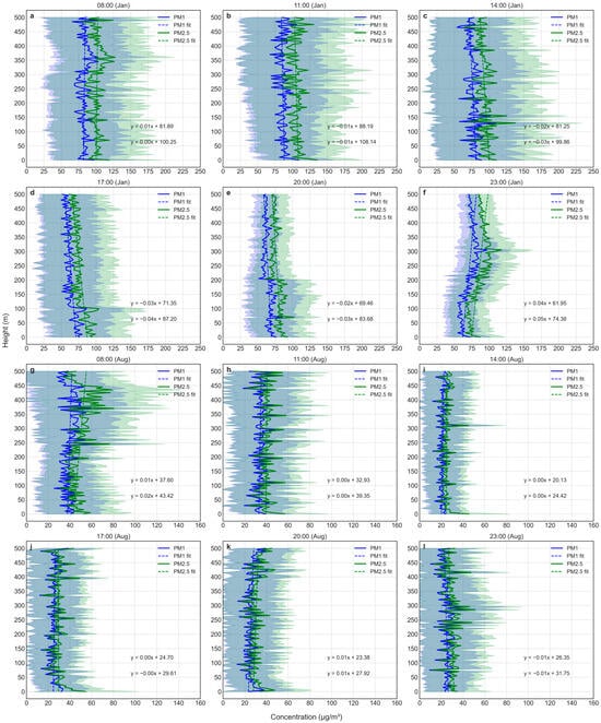 The vertical profiles of PM concentrations. (a–f) at different times in January, 2019. (g–l) at different times in August, 2019. The solid lines represent the concentration changes of vertical observation, and the shaded areas are the standard deviations. The dashed lines are the linear fitting results.