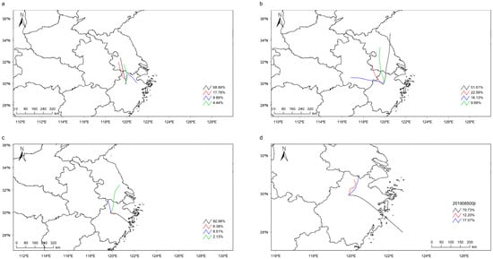 Winter analyses (January 2019) demonstrated pronounced boundary layer stratification effects, with the 300 m level (Figure 3a) dominated by four mesoscale clusters originating from proximate industrial corridors in southern Jiangsu, Hangzhou, and Ningbo. This low-altitude confinement (frequency >65%) reflects strong near-surface pollutant accumulation under winter-specific meteorological constraints, including persistent temperature inversions and subsidence-driven atmospheric compression []. In contrast, trajectories at the 500 m altitude (Figure 3b) exhibited long-range transport features, with air masses mainly originating from central Yangtze River Delta regions and parts of Anhui, potentially driven by high-altitude wind fields and persistent anticyclonic conditions that facilitated long-distance pollutant transport [,].