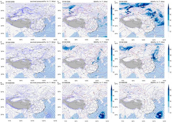 Synoptic weather pattern at 08:00 (UTC+8) on 20 January 2019, 25 January 2019, 23 August 2019. (a) sea level pressure, 20 January 2019. (b) 950 hPa, 20 January 2019. (c) 850 hPa, 20 January 2019. (d) sea level pressure, 25 January 2019. (e) 950 hPa, 25 January 2019. (f) 850 hPa, 25 January 2019. (g) sea level pressure, 23 August 2019. (h) 950 hPa, 23 August 2019. (i) 850 hPa, 23 August 2019. Meteorological elements on the isobaric surface were extracted, and the atmospheric circulation field at this level was visualized. The wind field was represented using vector arrows, with wind speed indicated by both the length of the arrows and the presence of barbs. The geopotential height field was depicted as solid blue contour lines, while the temperature field was represented by dashed red lines.