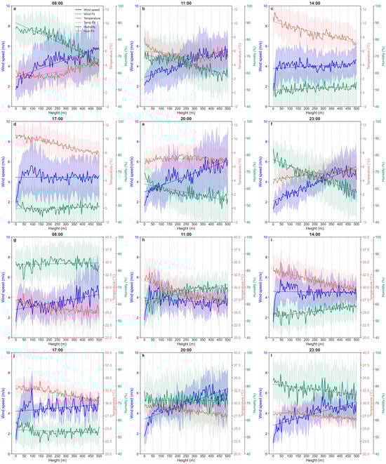 The vertical profiles of wind speed, temperature, and humidity at different times in January and August, 2019. (a–f) at different times in January, 2019. (g–l) at different times in August, 2019. The shaded areas are the standard deviations. The solid lines represent the observed results, while the dashed lines indicate the linear fitting results.