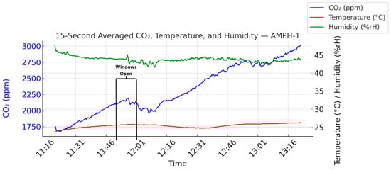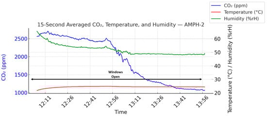 CO2 concentration patterns and air quality varied markedly across the experimental conditions due to differences in ventilation quality, occupancy, and spatial configuration. In AMPH-1, a slight dip in CO2 after a break was followed by a steady increase, suggesting ineffective ventilation. While this change was statistically significant (p = 4.6 × 10−10), the small effect size (Cohen’s d = 0.26) confirms only a minor practical improvement when windows were opened, likely due to suboptimal window positioning and inadequate airflow capacity. In AMPH-2, CO2 concentrations consistently decreased over time yet remained substantially above the 1000 ppm threshold (mean = 1906 ppm, p = 1.6 × 10−29, Cohen’s d = 1.45), indicating persistent air quality issues. The improvement likely resulted from better window placement and partial ventilation, but high initial values—likely from prior occupancy and poor pre-ventilation—tempered the overall effectiveness.