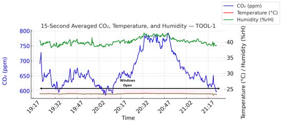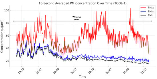 TOOL-1 showed persistently high PM values despite open windows. PM10 averaged 58.15 µg/m3 (p = 6.2 × 10−50, d = 0.46), PM2.5 was 28.24 (p = 4.7 × 10−221, d = 1.2), and PM1 reached 24.79 (p < 1 × 10−300, d = 2.08), all far above standard thresholds. These elevations are strongly linked to indoor metalworking activity [48] and possible infiltration from polluted outdoor air. In CLASS-1, PM levels were low and stable. PM10 dropped significantly from 36.44 to 30.79 µg/m3 with window opening (p = 6.3 × 10−4, d = 0.35), while PM2.5 and PM1 changes were minimal and of limited practical significance (PM2.5: p = 0.26, d = 0.11; PM1: p = 0.032, d = 0.22). Tiled flooring and minimal external PM infiltration contributed to the favorable indoor environment.